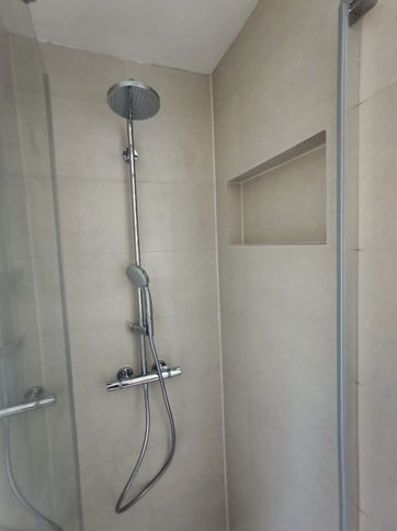 The finished bathroom now includes a modern walk-in shower, new tiling and updated fittings, creating a much cleaner and more practical space.